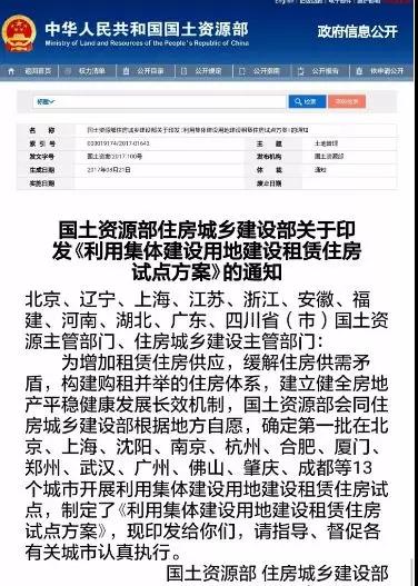 一个超级重磅的楼市调控措施公布了:国土部、住建部联合发布了《利用集体建设用地建设租赁住房试点方案》,宣布将13个城市纳入试点! 这是楼市调控以来,真正意义上的大招,其影响将非常巨大,对于楼市堪称重磅炸弹,显示出中国楼市格局的重大变化。参与试点的1...